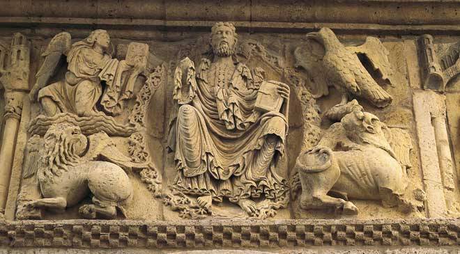 Rezar delante de una fachada medieval es un reto maravilloso pera el hombre del siglo XXI. Os propongo el pórtico de la iglesia de Santiago, en Carrión de los Condes (Palencia). Allí se expresa magníficamente la presencia del Señor en el trasunto de lo humano. De la iglesia ya sólo queda la fachada, lo demás se lo llevó un terrible incendio que pudo con la piedra. Debajo del tejadillo hay un friso con el Pantocrátor en el centro, rodeado de los doce apóstoles, muchos de ellos descabezados por el tiempo, el fuego y las guerras. Cristo está sentado en la postura tradicional, con las piernas flexionadas tal y como, por comodidad, se sientan los orientales en el suelo. La intención del rostro de todo Pantocrátor es transmitir sensaciones de equilibrio y serenidad perfecta. En las ocasiones donde la cara es adusta, al artista le pudo más la intención de destacar la naturaleza divina de Cristo, de ahí la impresión de un equívoco enfurruñamiento. En cambio, el Pantocrátor de Carrión es de una serenidad que no cansa. Hay en ese rostro una característica muy típica en todo el románico, la de querer llevarse al espectador a adentrarse en el misterio. No es un mero retrato en piedra, anodino. Se parece a la Palabra de Dios pronunciada en el templo, es el instante en que Dios suelta sus hilos de seducción para atraer al hombre hacia sí. Más abajo está la arquivolta, sólo una arquivolta, y me fijo en las figuras que están allí esculpidas en el arco de medio punto. Son hombres y mujeres que representan oficios ordinarios: forjador, hojalatero, acuñador de monedas, hay un tipo leyendo un libro, un músico, un panadero, una danzarina en el instante de llevar atrás la espalda. Bajo los capiteles de las columnas hay alusiones al más allá, la salvación, la vida eterna. Es decir, el hombre medieval llegaba cansado de cultivar las vides en la parcela del señor, con los aperos al hombro, y antes de entrar en la iglesia de Santiago a saludar al Señor de su vida, miraba la fachada de la iglesia y entendía su papel en el mundo.