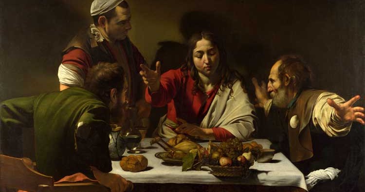 La escena de este óleo narra los primeros pasos de Cristo resucitado. Habiendo encontrado éste a dos de sus discípulos en el camino a Emaús, los hombres no reconocen a su maestro hasta el momento de la cena en una posada, pues al bendecir Jesús el pan y el vino reconocen el gesto de la Eucaristía y, por ende, a su Señor. Caravaggio ha utilizado una composición muy frecuente en la pintura veneciana, en especial de Tiziano, con Cristo en el centro, acompañado de un sirviente. Sin embargo, ha llenado la escena de sutiles indicativos de la divinidad y el misterio desvelado de la resurrección, que algunos coetáneos de Caravaggio criticaron por ser inapropiados. Uno de estos elementos fue el cesto de frutas que adorna la mesa: copiado literalmente del Cesto de Frutas, se censuró el que contuviera frutos de otoño, cuando la resurrección había tenido lugar en primavera. Sin embargo, como apreciamos en el comentario del citado Cesto, cada fruta es una alusión simbólica: la manzana al pecado original, la granada a la pasión, etc. Por otro lado, el resto de los manjares resume los elementos de la Eucaristía: el pan, el vino y la jarra de agua. Los gestos y las posiciones de los personajes también nos indican el verdadero significado de la escena: Cristo bendice el pan con el mismo gesto del Dios Creador del Juicio Final de Miguel Angel. Pedro extiende sus brazos en el mismo gesto de un crucificado, como lo fue Cristo y como lo habría de ser el apóstol más tarde. Sólo los discípulos pueden reconocer el gesto de Cristo, por lo que el criado, ignorante de lo que está presenciando, no se ha descubierto la cabeza como haría si reconociera al Mesías. Un último detalle que revela la divinidad de Cristo oculta a los ojos humanos es la sombra que el criado proyecta sobre el fondo pero no sobre Jesús, quien parece iluminado por una luz interna.