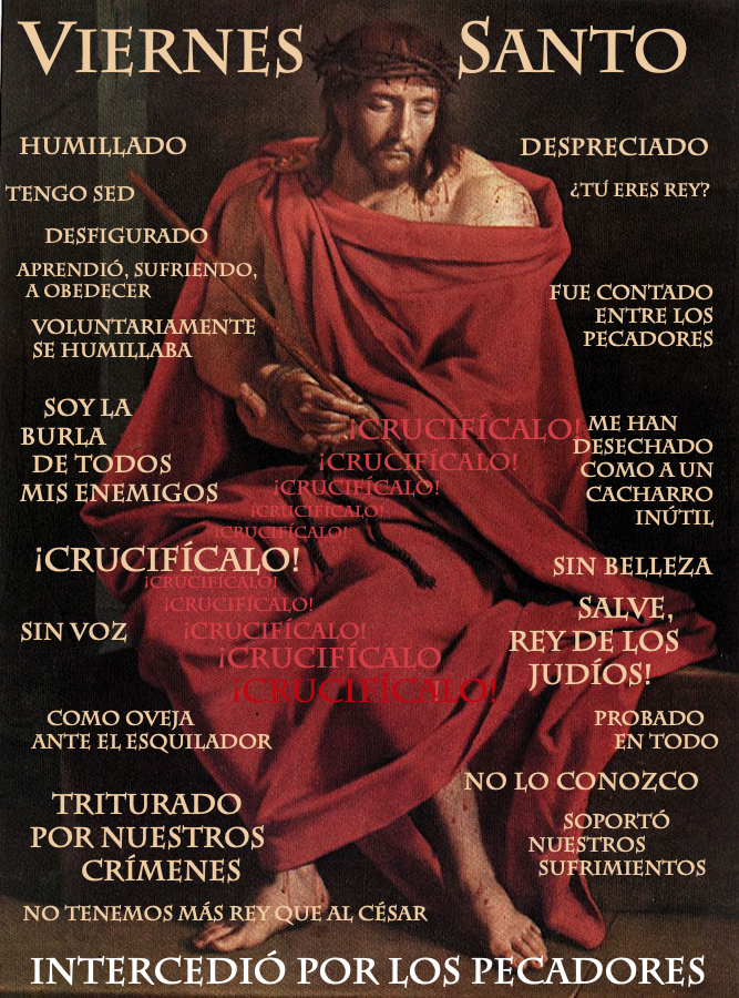Lo dramático de la cuestión, y esa es una pregunta habitual de los grandes teólogos, que son los niños, es que Dios no tenía porqué llevarlo a cabo de un modo tan cruel. Y es aquí donde el Amor de Dios se sumerge a unas profundidades abisales imposibles que nos provocan temor. Nos quedamos impotentes e indefensos contemplando estas escenas: “Maltratado, voluntariamente se humillaba y no abría la boca: como cordero llevado al matadero, como oveja ante el esquilador, enmudecía y no abría la boca”. “¡Salve, Rey de los judíos!”. “¡Crucifícale! ¡Crucifícale!”. ¿Por qué, Señor? Guíame en esta escuela del sufrimiento redentor.